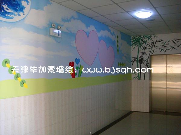 四樓是老師們的辦公區(qū)域,所以繪畫上,我們采用了山水畫,還給墻面留了學生們獲獎的手工作品的區(qū)域。